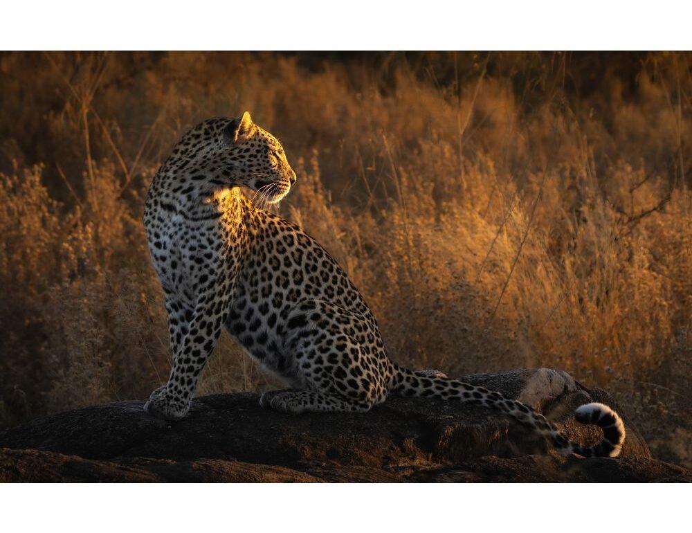 "This is a beautifully composed photograph that captures the elegance of the animal. The leopard is bathed in warm, golden light that highlights its calm demeanour, while the soft, blurred background creates a sense of serenity." Will Burrard-Lucas
