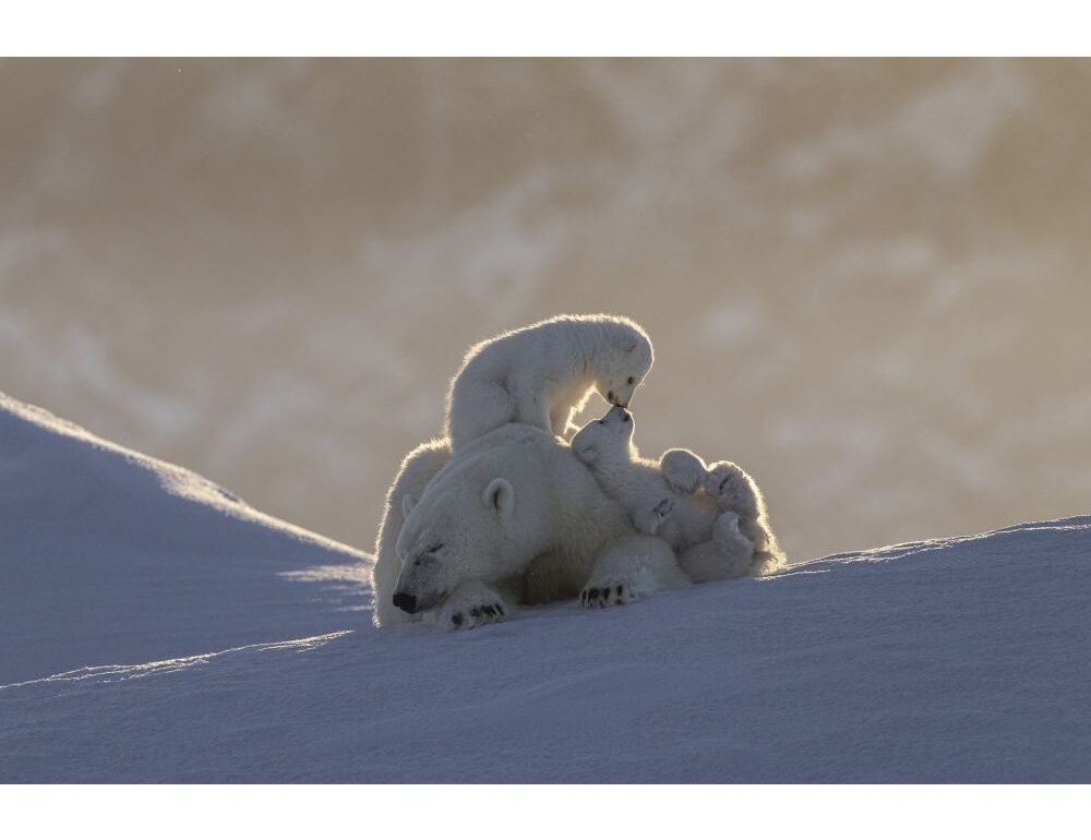 "Baffin Island is one of the most majestic & pristine environments in the world to see polar bears, especially in March & April when the sea ice has frozen. However, with temperatures between-30 to -40 it is also one of the most challenging to ensure you keep your hands warm to press the shutter. We had spent most of the morning & part of the afternoon with this mother & her COYS (Cubs of the year) which were likely a week or so out of their den. However, just as they were settled the mother got spooked & she & the cubs ran off towards a nearby iceberg. We set off to see if we could spot them & when we got to this iceberg I couldn't believe my eyes. The mother & cubs were huddled together on top of the iceberg. To witness such intimate moments, such as this one, between the cubs whilst their mother rests is something that is a once in a lifetime sighting."