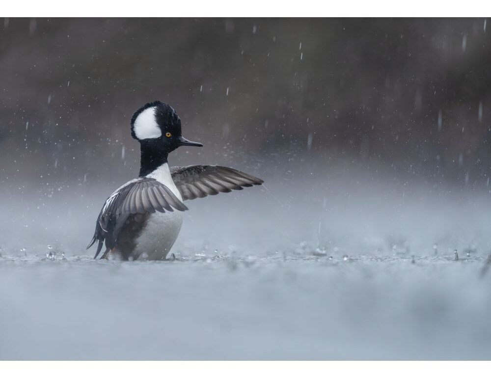 "Amid heavy rain, a male hooded merganser searches for food in the water. After catching and swallowing a fish, it rises and performs a dramatic wing flap - an elegant display of power and poise, even in the storm."