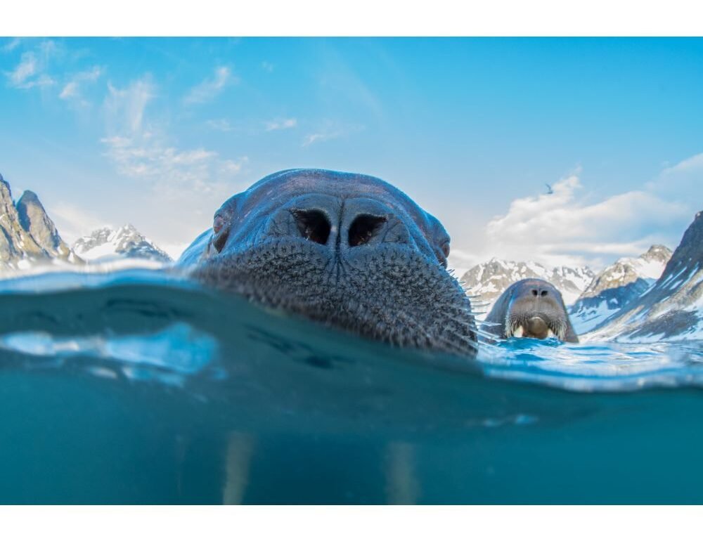 "The Atlantic walruses swimming in the light of the midnight sun of Svalbard were so beautiful to watch. At one point, a couple of curious ones decided to swim toward me and I was able to capture this magical moment. The walrus population was once decimated by hunting but has rebounded. However, climate change makes their future uncertain. Atlantic walruses are listed as Near Threatened on the IUCN Red List. I hope this image inspires people to care about this beautiful species and the majestic environment that they live in. This image was taken with a pole-cam."