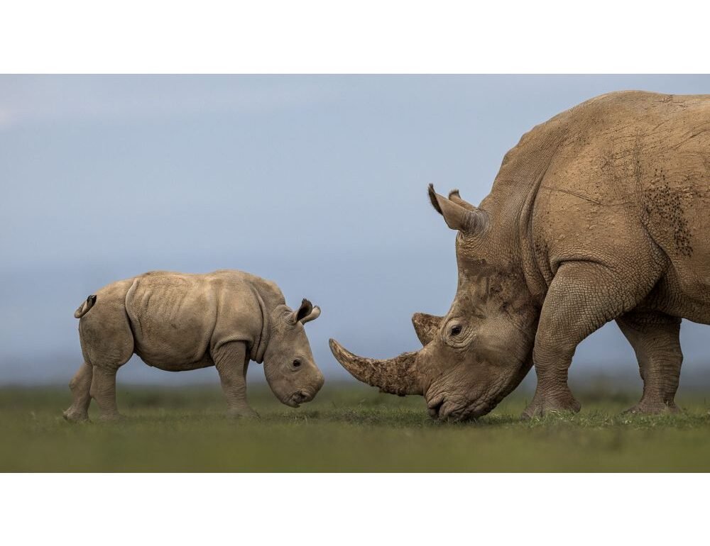 "Solio Reserve is a private sanctuary dedicated to the conservation of white & black rhino & has run the most successful rhino breeding programme in East Africa. I was able to get this image of a 1 month old rhino calf & its mother by lying on the ground so your eye is focused on their interaction. Rhino calves are born without horns & these develop from about six months. Hopefully in this reserve, which has incredible protection for their rhinos, the rhino calf will grow horns as big as its mothers without fear from poachers."