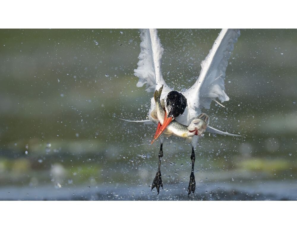 Reesor Pond in Markham, Ontario, Canada. "A tern emerges in a burst of water as it seizes a large pike, showcasing the precision and power of avian hunting."