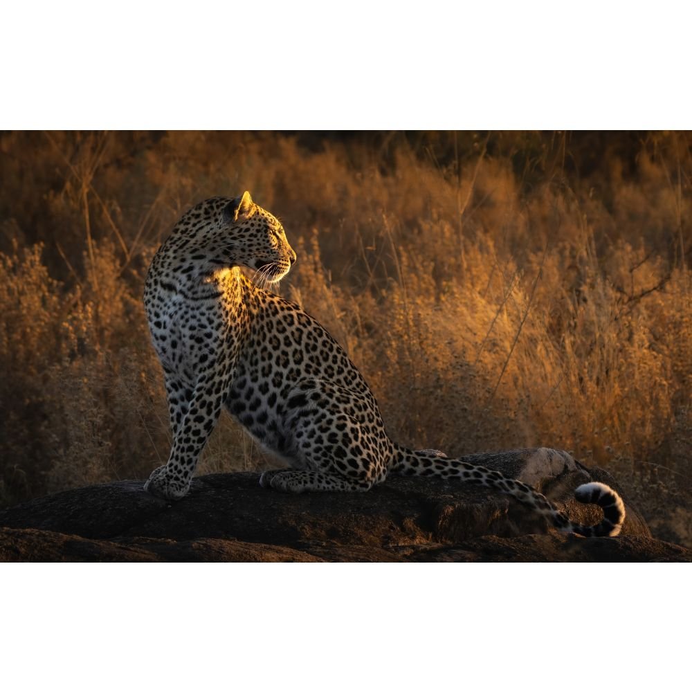 "This is a beautifully composed photograph that captures the elegance of the animal. The leopard is bathed in warm, golden light that highlights its calm demeanour, while the soft, blurred background creates a sense of serenity." Will Burrard-Lucas