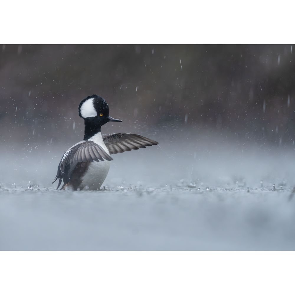 "Amid heavy rain, a male hooded merganser searches for food in the water. After catching and swallowing a fish, it rises and performs a dramatic wing flap - an elegant display of power and poise, even in the storm."