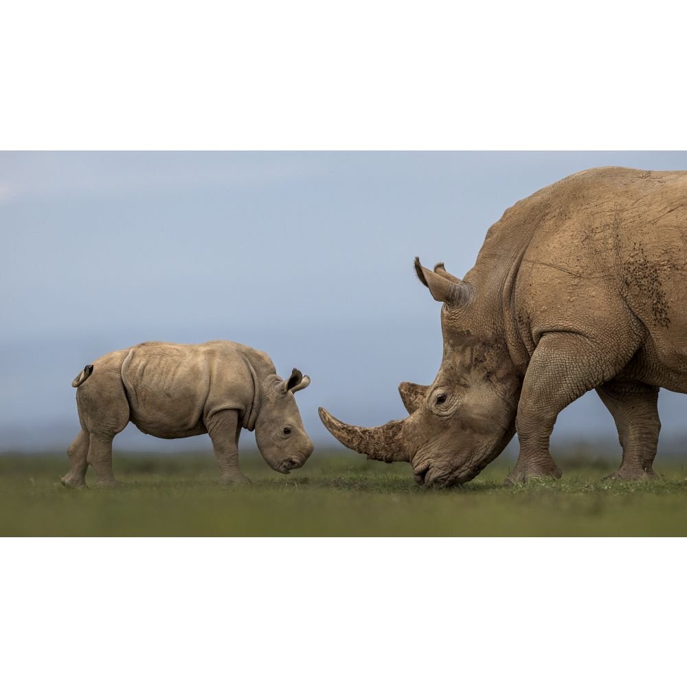 "Solio Reserve is a private sanctuary dedicated to the conservation of white & black rhino & has run the most successful rhino breeding programme in East Africa. I was able to get this image of a 1 month old rhino calf & its mother by lying on the ground so your eye is focused on their interaction. Rhino calves are born without horns & these develop from about six months. Hopefully in this reserve, which has incredible protection for their rhinos, the rhino calf will grow horns as big as its mothers without fear from poachers."