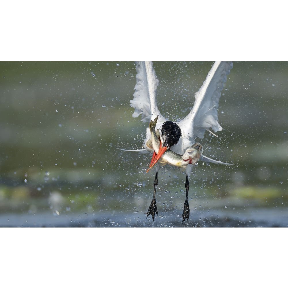 Reesor Pond in Markham, Ontario, Canada. "A tern emerges in a burst of water as it seizes a large pike, showcasing the precision and power of avian hunting."