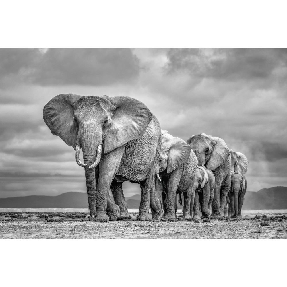"Shortly after we passed a beautiful breeding herd of elephants making their twice-daily crossing of a dry lakebed between the forests at the foot of Mt Kilimanjaro and a water source, our guide stopped the safari vehicle. He encouraged my husband and me to get out and lie on the ground. Apprehensive about the approaching herd, I trusted our knowledgeable guide, who understood elephant behavior. This led to one of the most unforgettable and thrilling photographic experiences of my life. As the herd silently moved within 20 meters of us, they never took their eyes off of us. I held my nerve and clicked the shutter. There's nothing quite like photographing elephants from a ground level perspective. It's in that moment you truly realize just how small you are next to these gentle giants. Listed as endangered on the IUCN Red List, elephant populations continue to decline, driven by illegal poaching for ivory, extensive habitat loss from human development, and increasingly severe human-elephant conflicts. Dedicated conservation work, including stronger protections and anti-poaching patrols, are crucial to reversing elephant population declines."